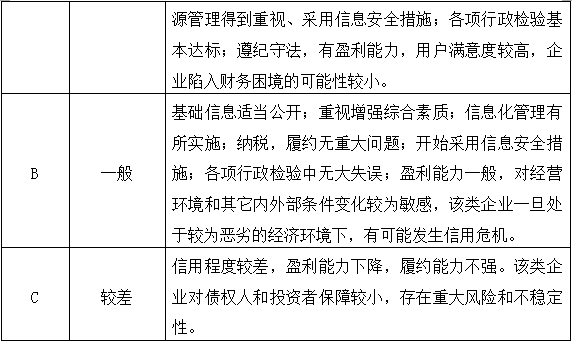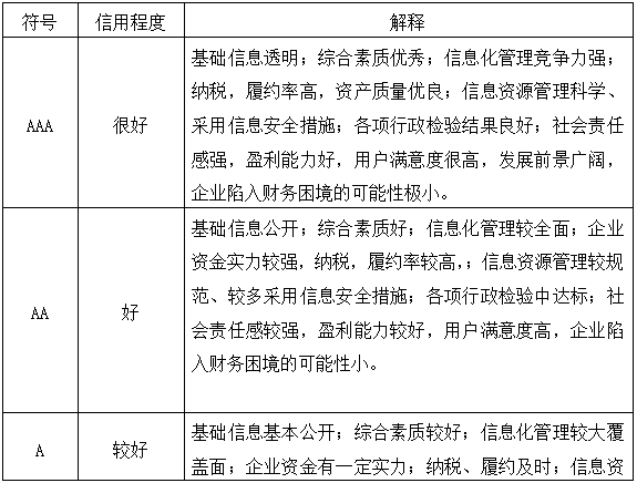 企業(yè)信用等級統(tǒng)一劃分為AAA、AA、A、B、C三等五級,含義如下: